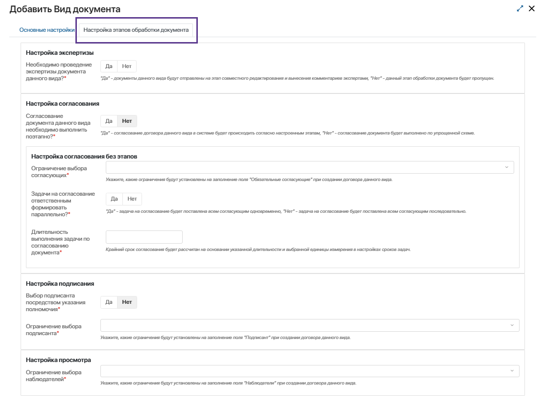 Выполнять проверку срока действия полномочия перед согласованием/подписанием дополнения к договору* – укажите, нужно ли выполнять проверку срока действия полномочия перед задачами согласования или подписания дополнения к договору. При выборе «Да» система проверяет статус полномочия перед задачами согласования или подписания дополнения к договору и отправляет его на доработку, если полномочие недействующее.