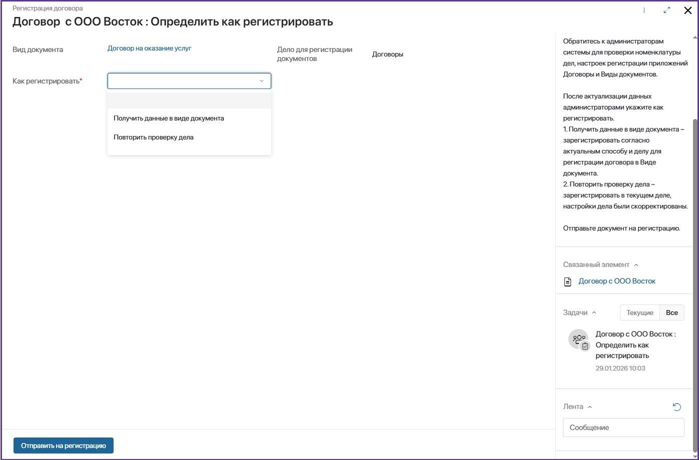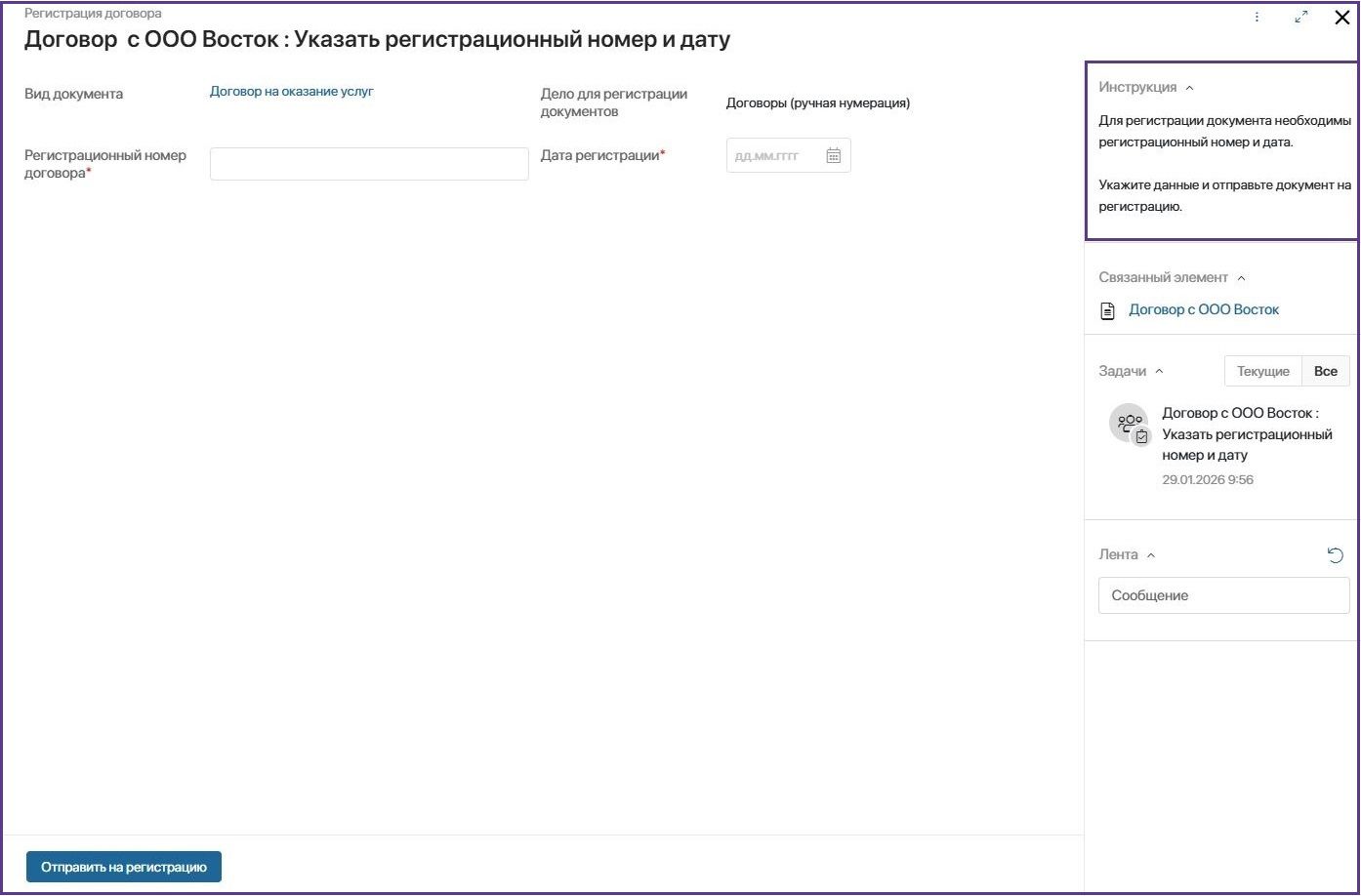 - Документ не подписан. Вернуть на доработку – ответственный за документ получит задачу ««Доработать данные договора».