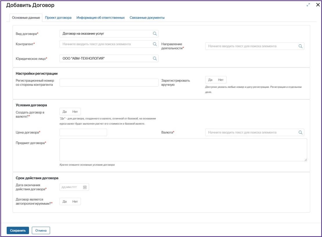 | Направления деятельности | Выбор направлений деятельности при создании договора для последующего поиска и фильтрации документов, для анализа данных | |