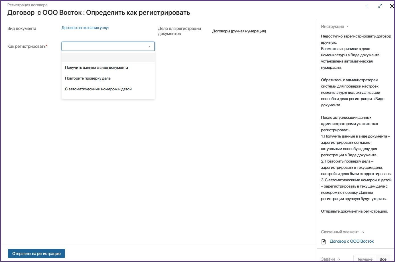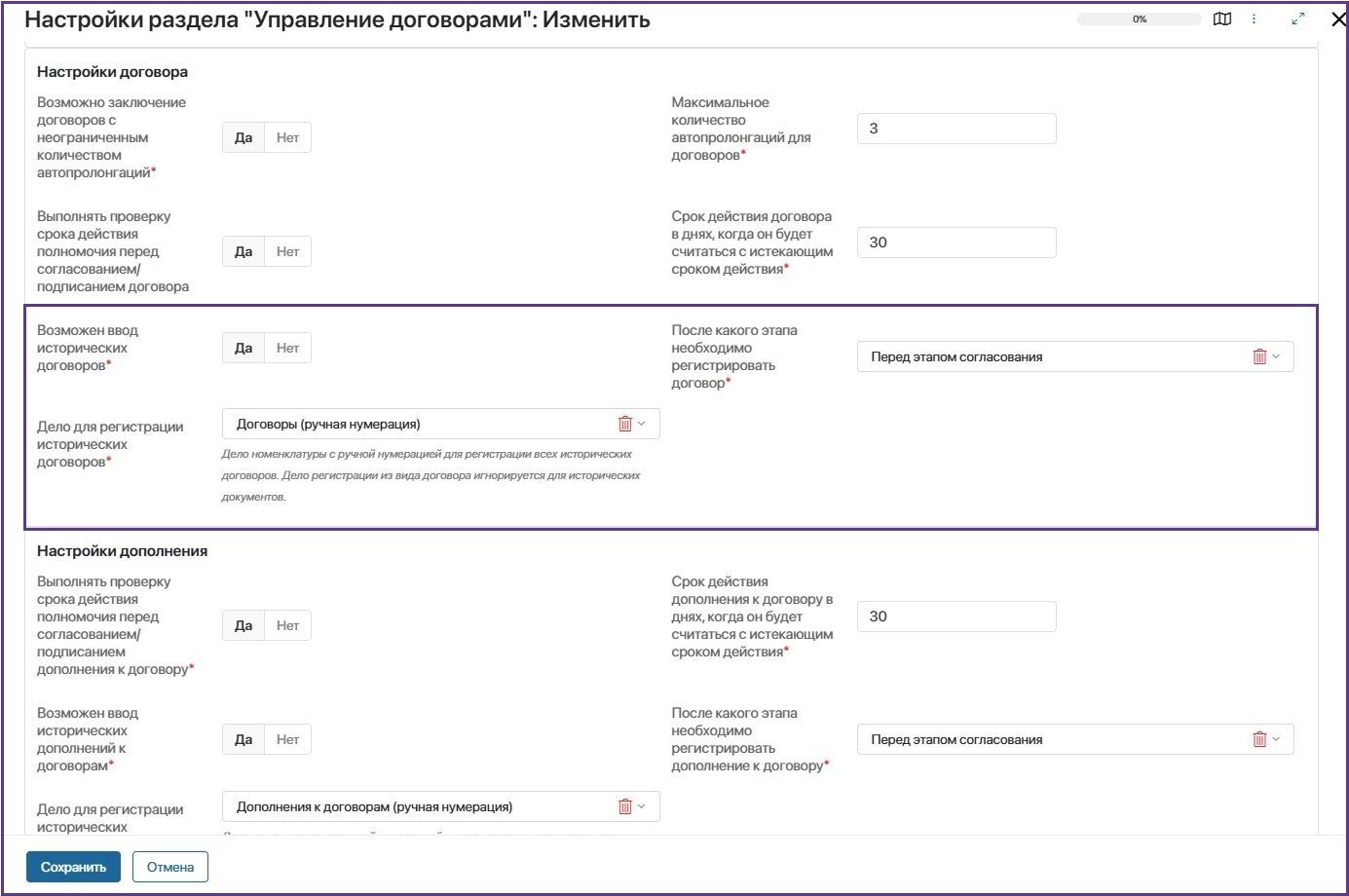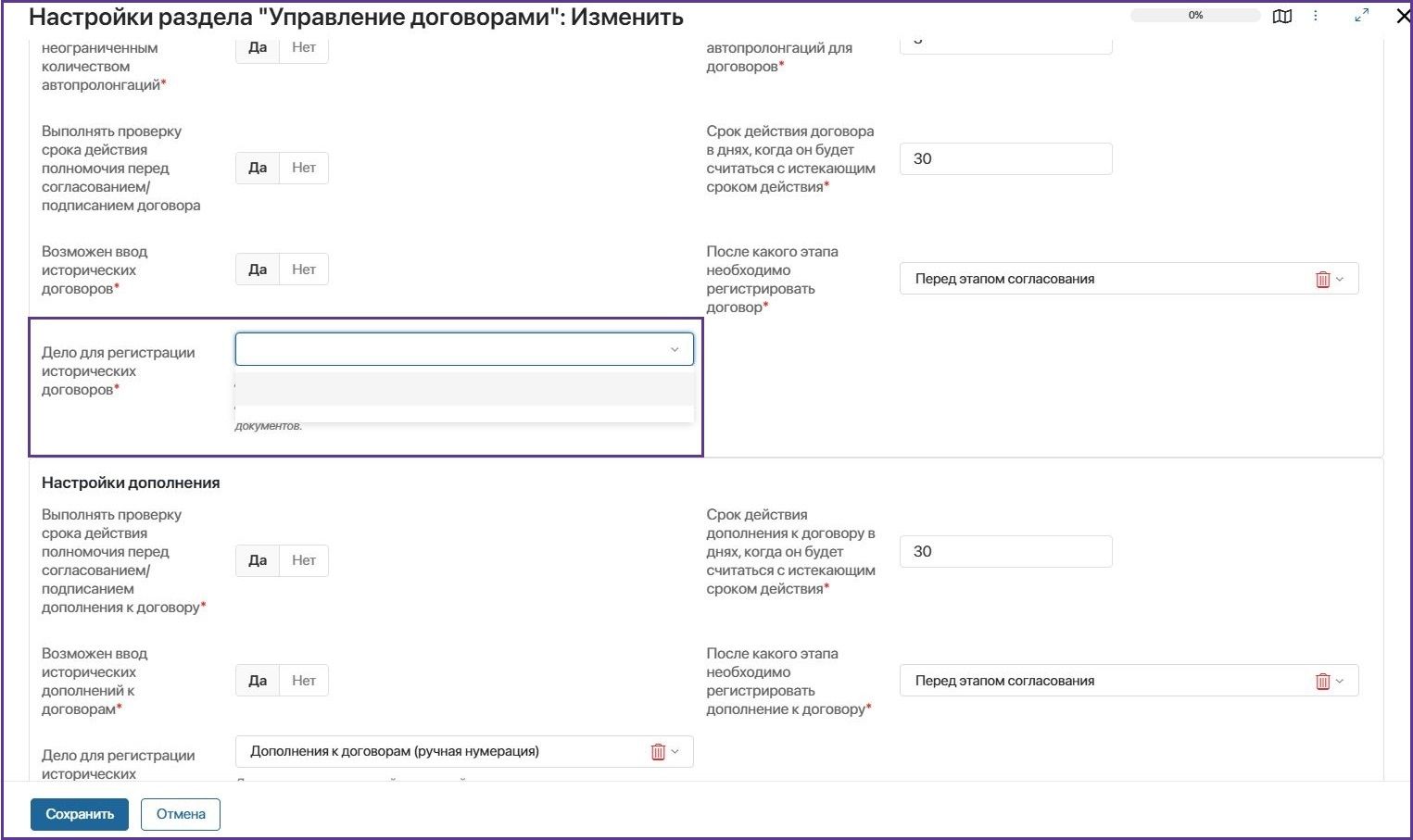 Дело для регистрации исторических договоров* – выберите дело номенклатуры с ручной нумерацией для регистрации всех исторических договоров. Дело регистрации из вида договора игнорируется для исторических документов. Если в списке нет доступных для выбора дел номенклатуры, обратитесь к администратору с просьбой создать дело с ручной нумерацией.