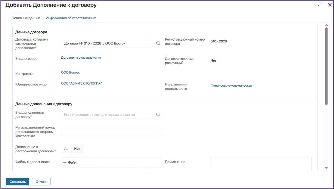 - Отправить на согласование – проект дополнения к договору будет направлен на согласование пользователям, указанным в поле «Согласующие» на вкладке «Информация об ответственных».