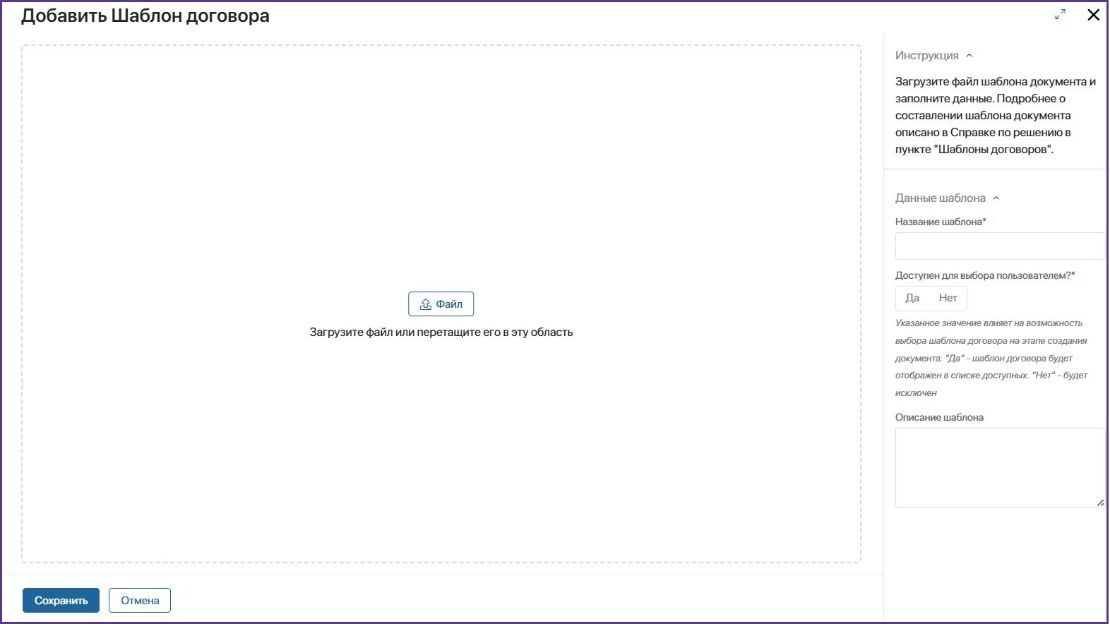 В случае, если при создании договора или дополнения к нему способ внесения проекта документа в систему будет определен как «Генерировать по шаблону», будут использованы записи этого справочника.