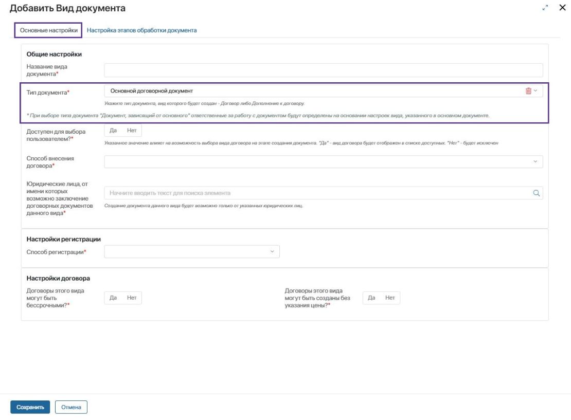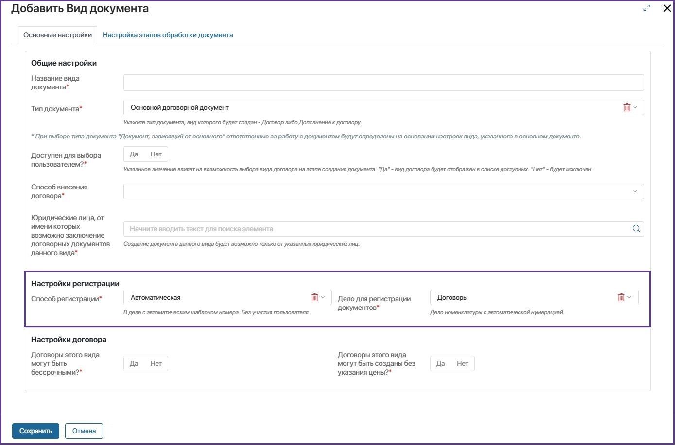 Для обеспечения функционирования раздела «Управление договорами» необходимо создать настройки раздела.