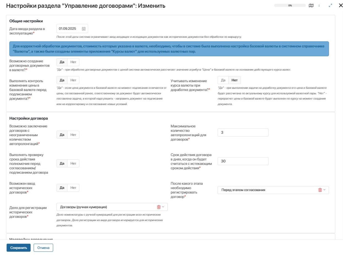 В справочнике «Настройки раздела» вы можете создать Настройки раздела или изменить уже существующие, которые будут применимы ко всем создаваемым договорным документам.