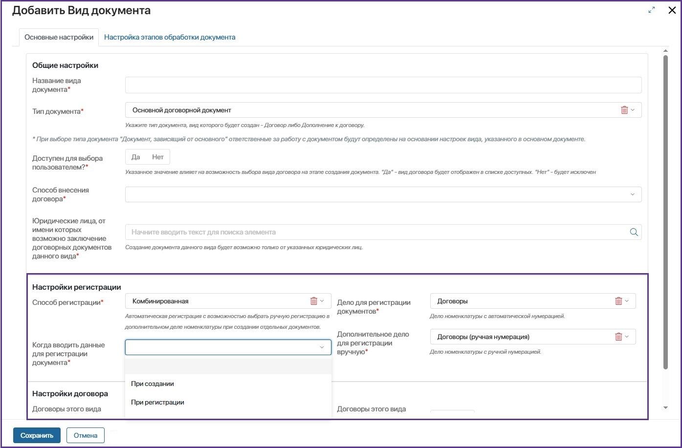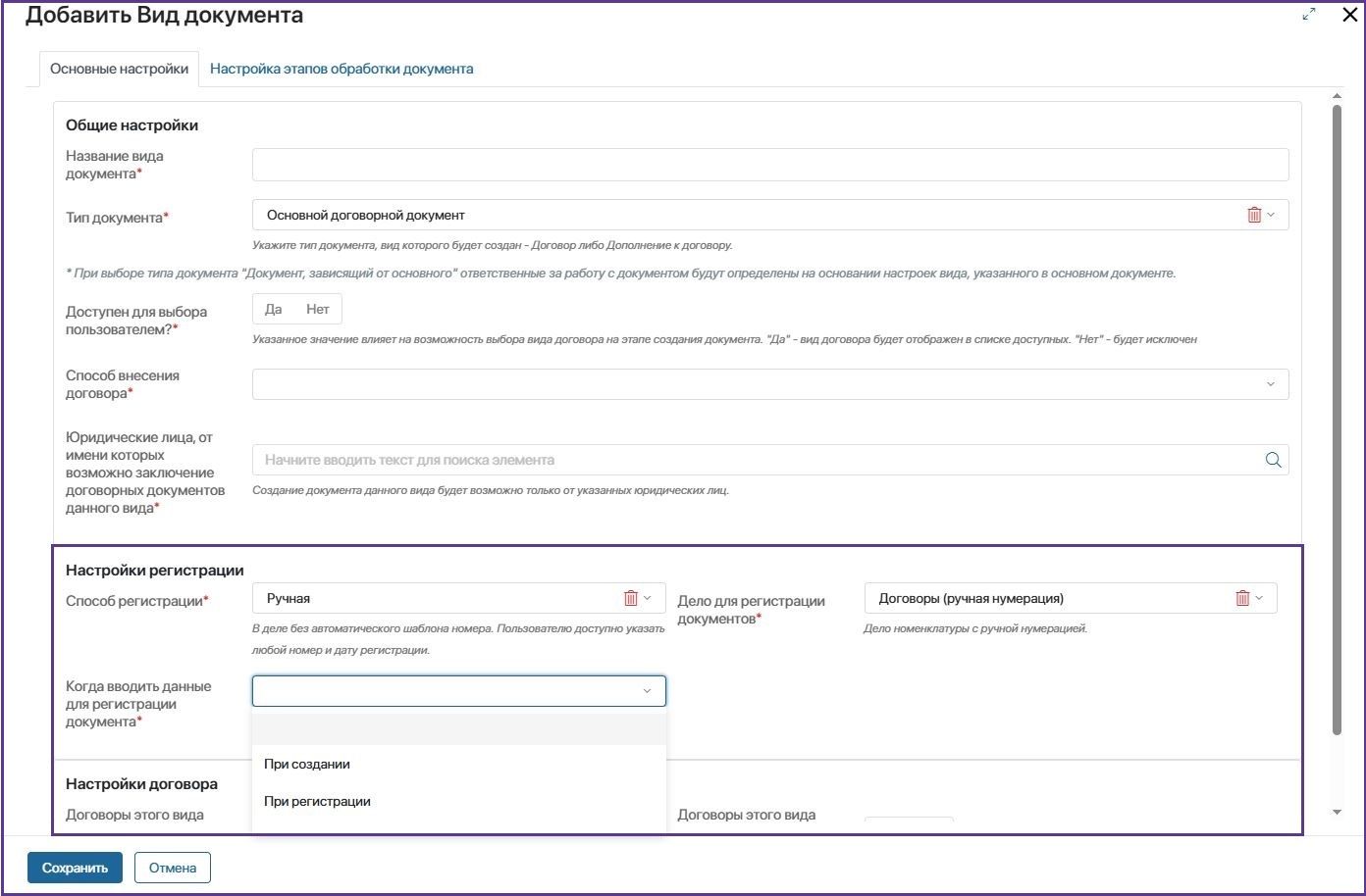 После какого этапа необходимо регистрировать договор* – выберите, после какого этапа необходимо отправлять договор на регистрацию.