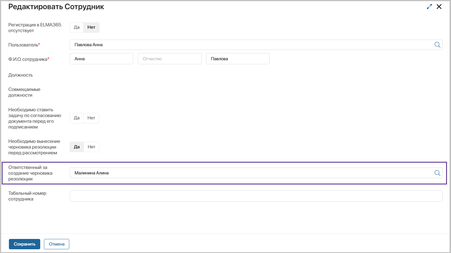 Создавать записи и редактировать уже созданные записи могут пользователи, состоящие в группе «Ответственные за настройку раздела «Управление корреспонденцией».