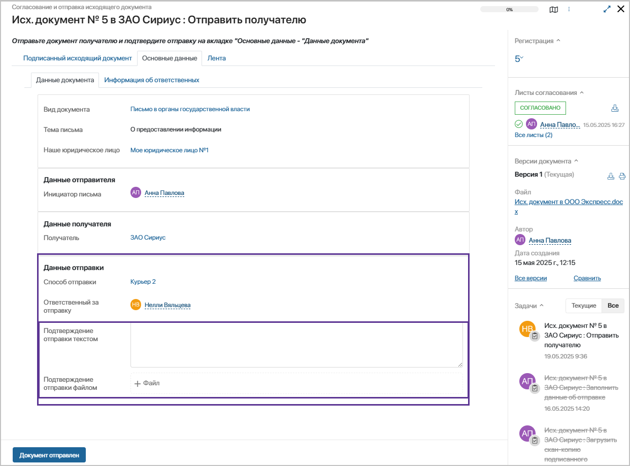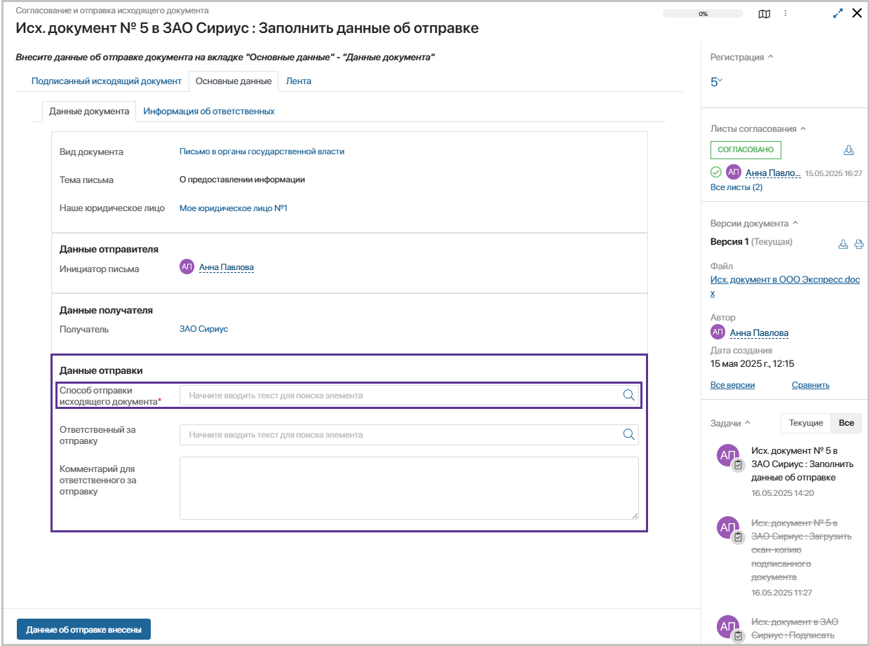 - Данные об отправке внесены – документ продолжит движение по маршруту, ответственному за отправку будет поставлена задача «Отправить получателю».