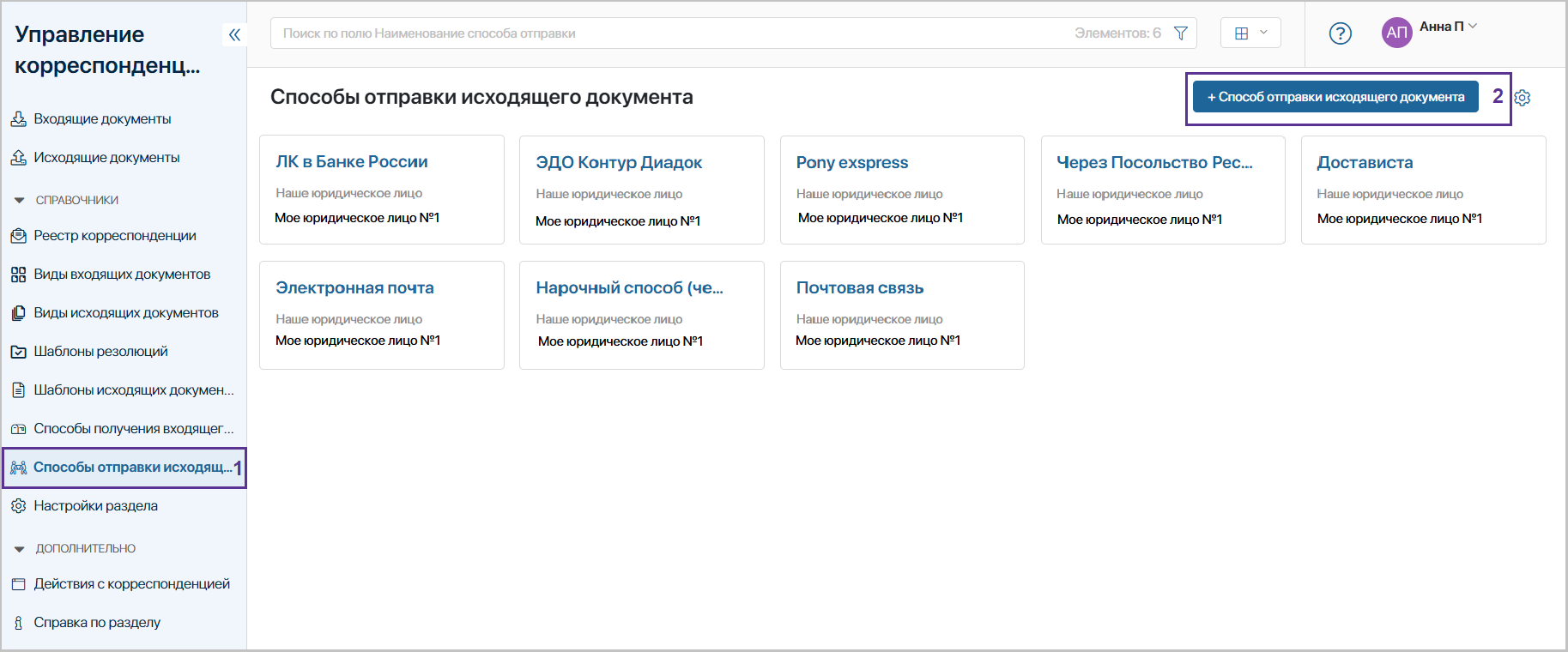Откройте приложение «Способы отправки исходящего документа» (1) и нажмите «+ Способ отправки исходящего документа» (2).