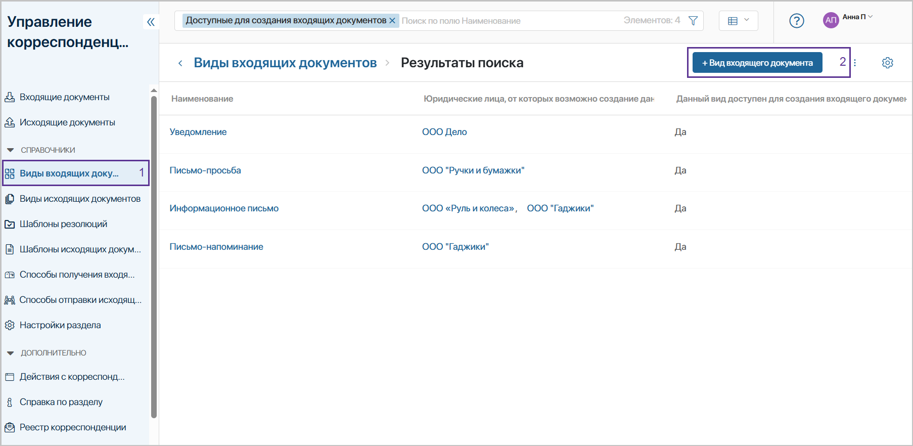 Наполнение справочника «Способы получения входящего документа» необходимо для указания способа получения входящего документа при создании и поиска всех входящих документов по такому параметру.