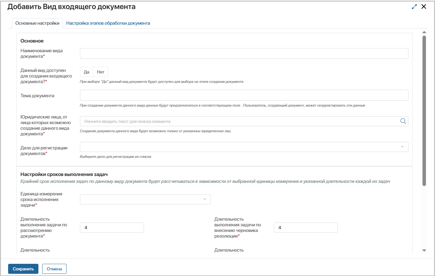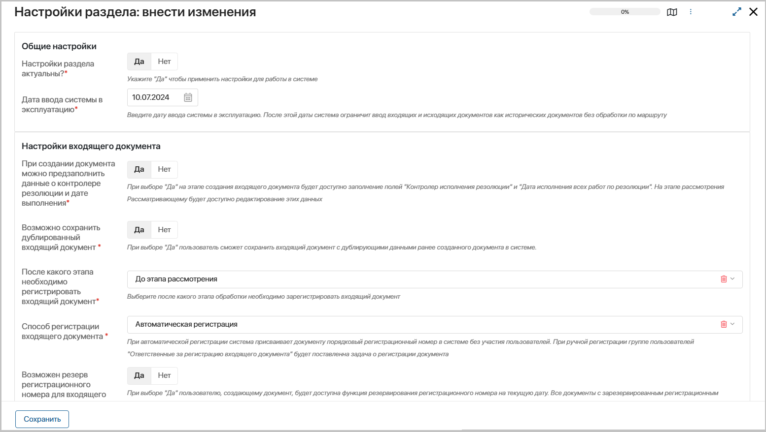 Возможен ввод исторических входящих документов – укажите «Да», если необходима функция ввода в систему входящей документации, полученной до начала эксплуатации системы. Документы будут сохранены без обработки по маршруту.