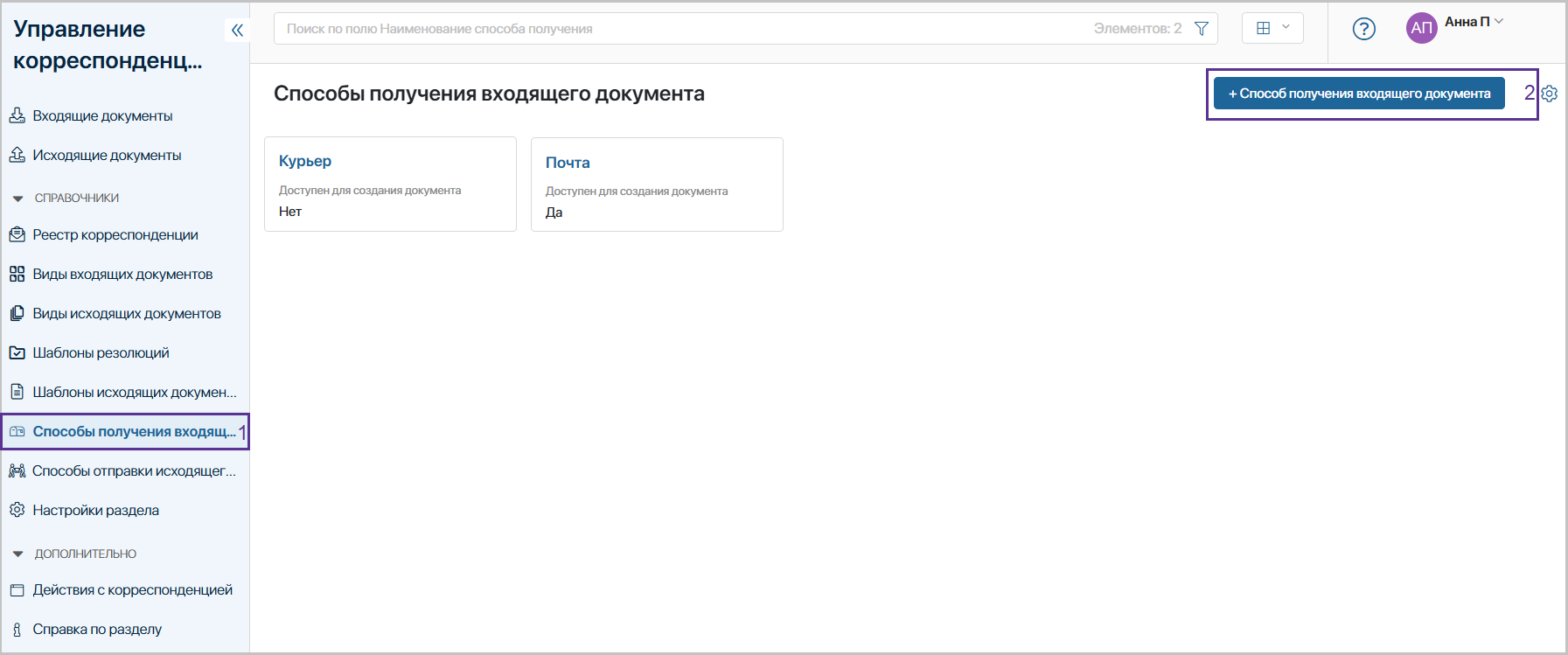 Откройте приложение «Способы получения входящего документа» (1) и нажмите «+ Способ получения входящего документа» (2).