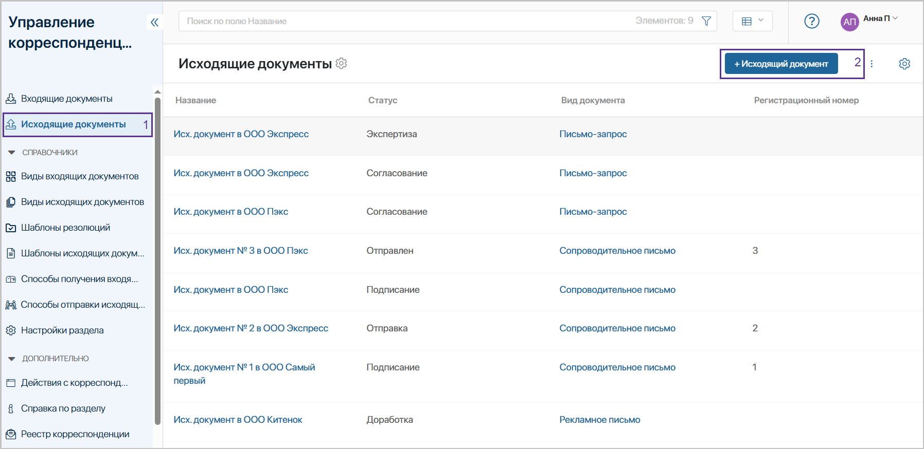 Откройте приложение «Исходящие документы» (1) и нажмите «+Исходящий документ» (2).