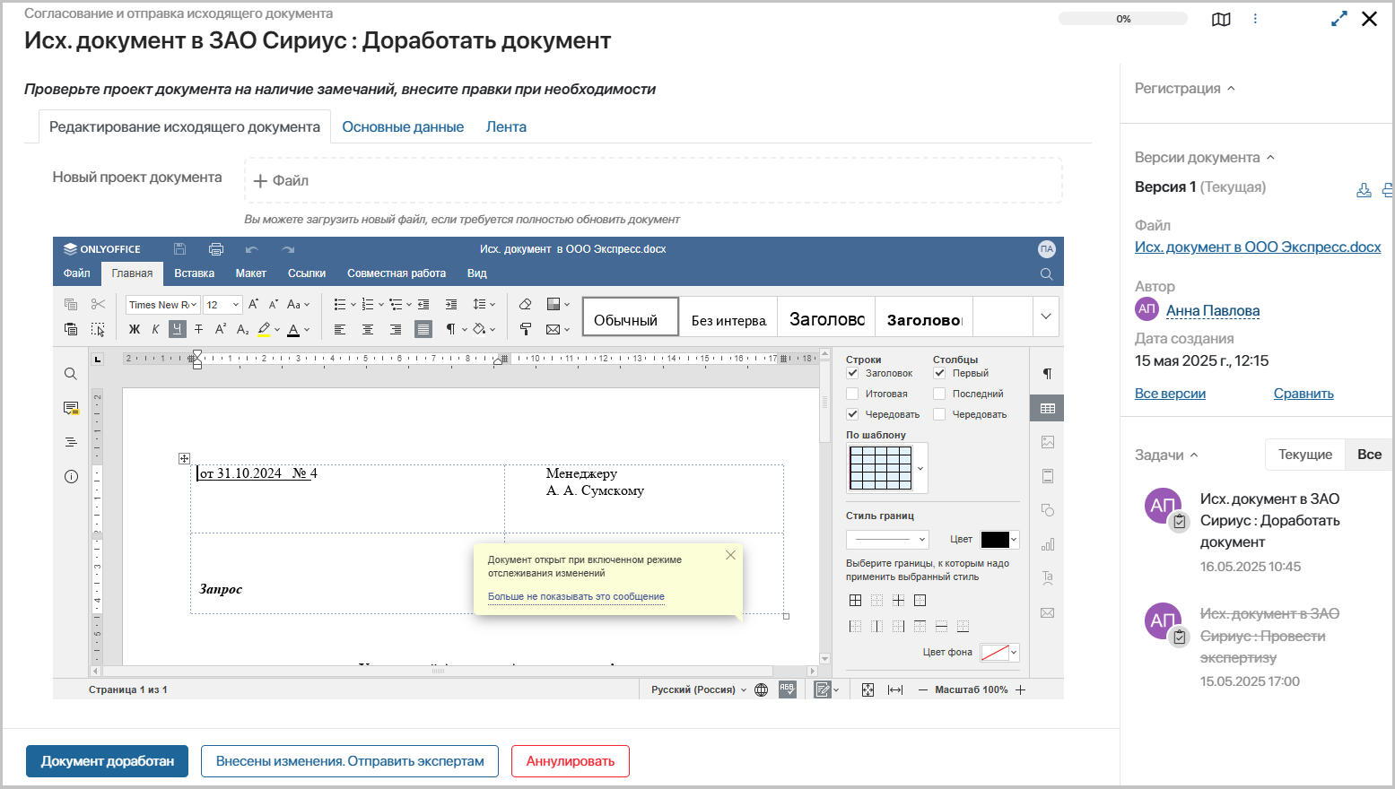 - Экспертиза завершена – ответственный за документ получит задачу «Доработать проект».