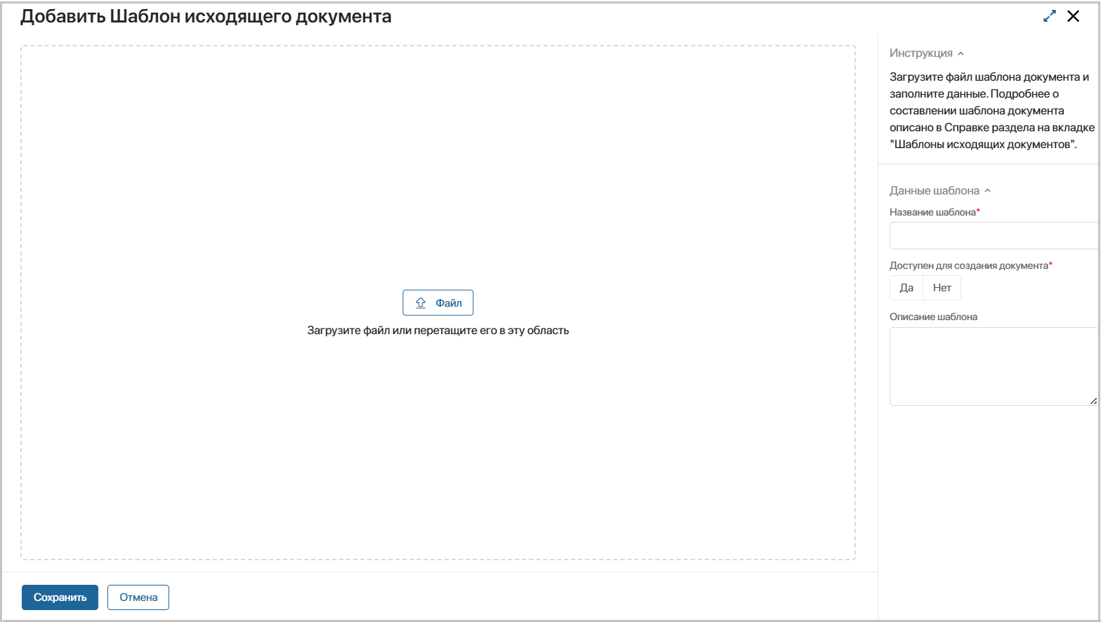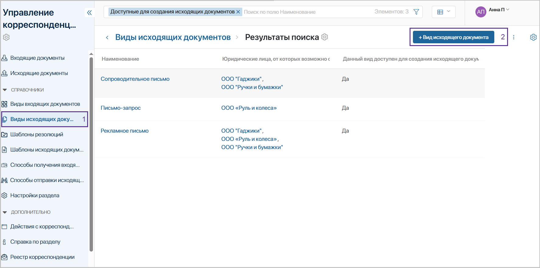 | Управление шаблонами документов | создавать, редактировать и просматривать все шаблоны исходящих документов |