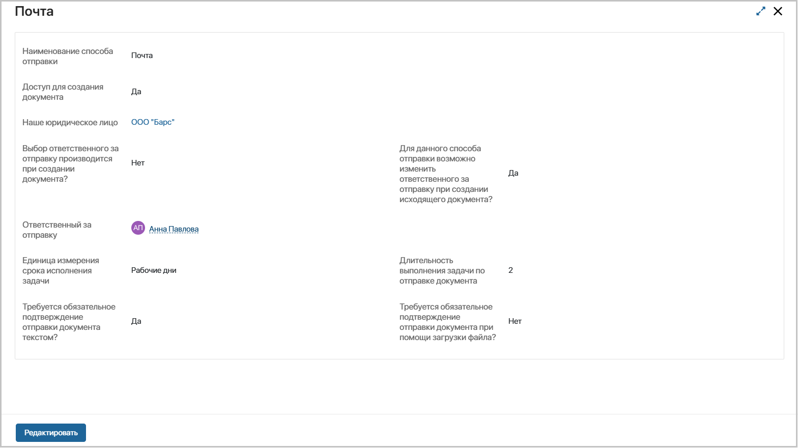 Наше юридическое лицо* – выберите юридическое лицо из списка, для которого может быть доступен создаваемый способ отправки. При создании исходящего документа система предложит все возможные способы отправки для выбранного ранее юридического лица.