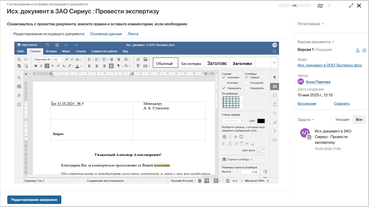 Создание исходящего документа