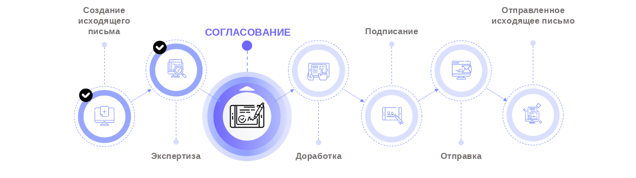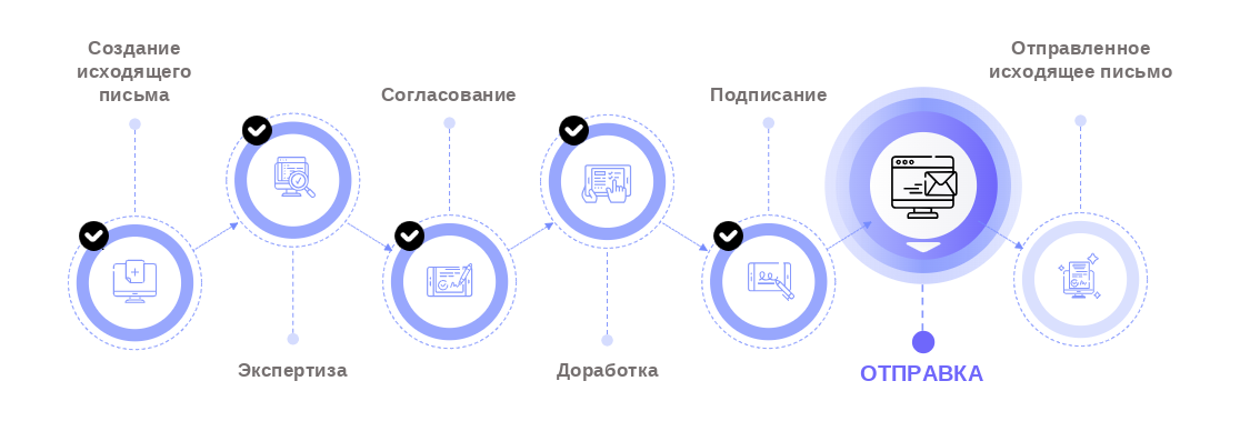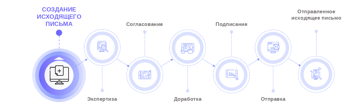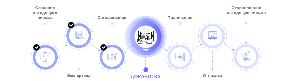 - Документ доработан – проект исходящего документа будет направлен на согласование, если оно предусмотрено видом исходящего документа, или на подписание, если этап согласования отсутствует.