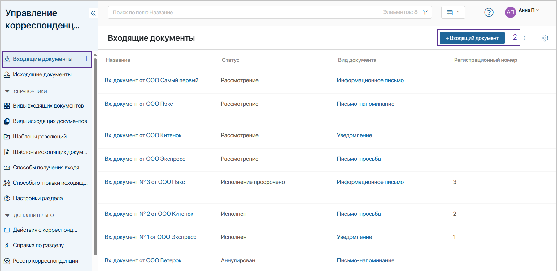 Для удобного поиска среди всех документов, хранящихся в решении, создан Реестр корреспонденции.