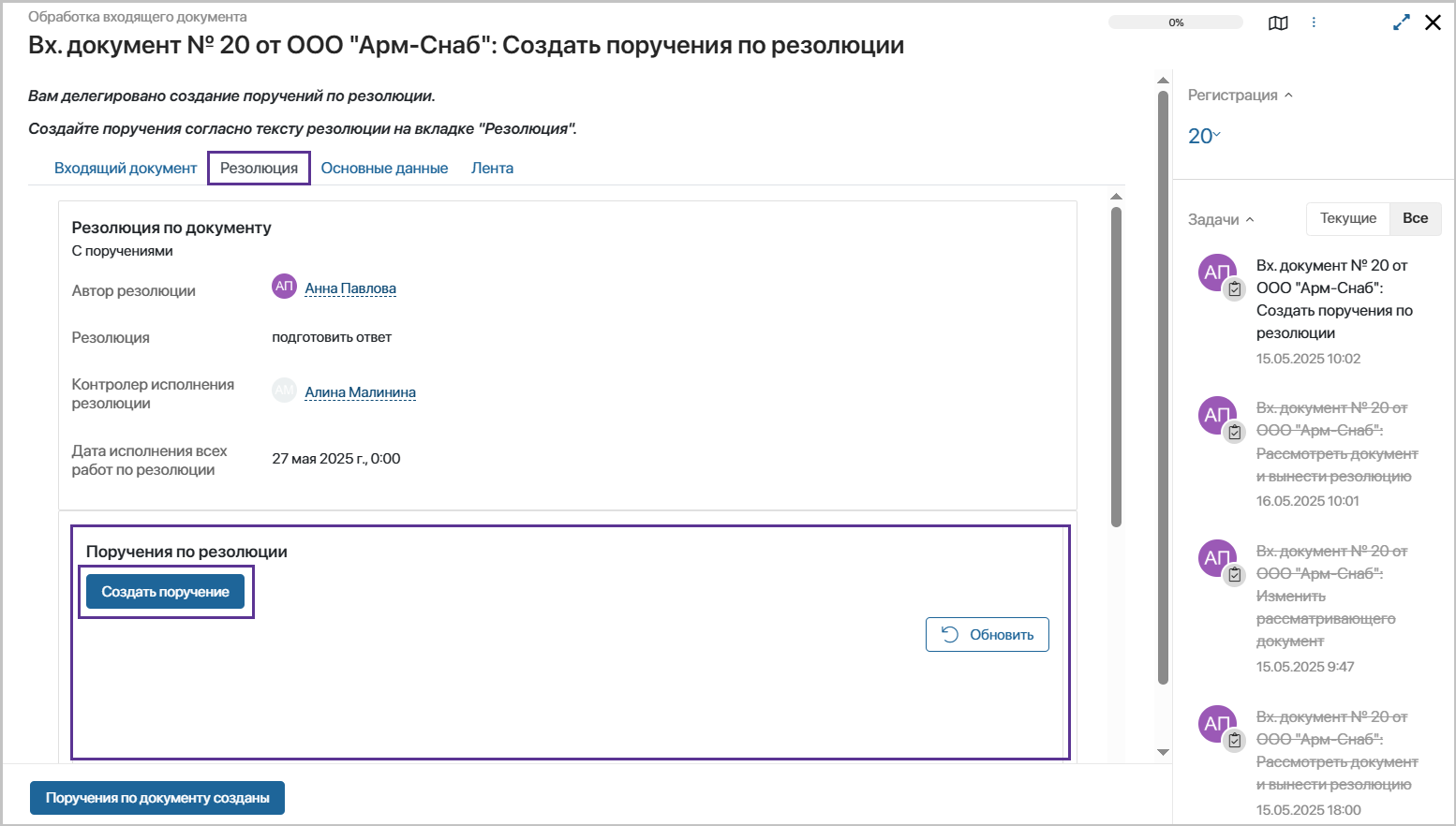 Подробное описание раздела «Управление поручениями» приведено в справке - Решение «Управление поручениями».