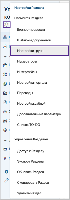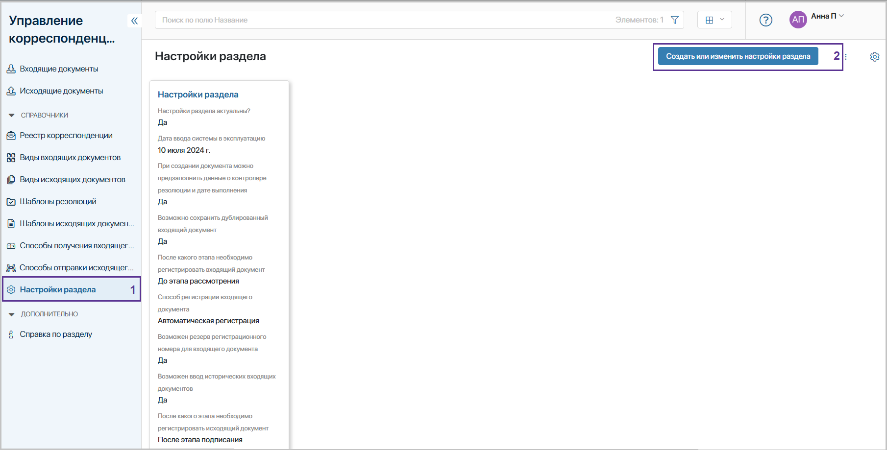 Важно! Создание или изменение настроек раздела доступно пользователям, включенным в группу «Ответственные за настройку раздела «Управление корреспонденцией».