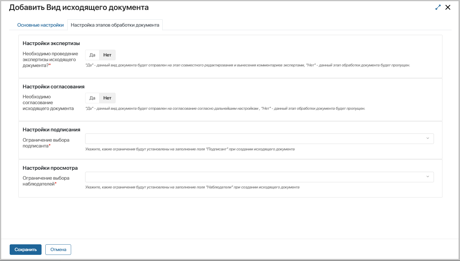 После какого этапа необходимо регистрировать исходящий документ – выберите, после какого этапа необходимо отправлять все исходящие документы на регистрацию.