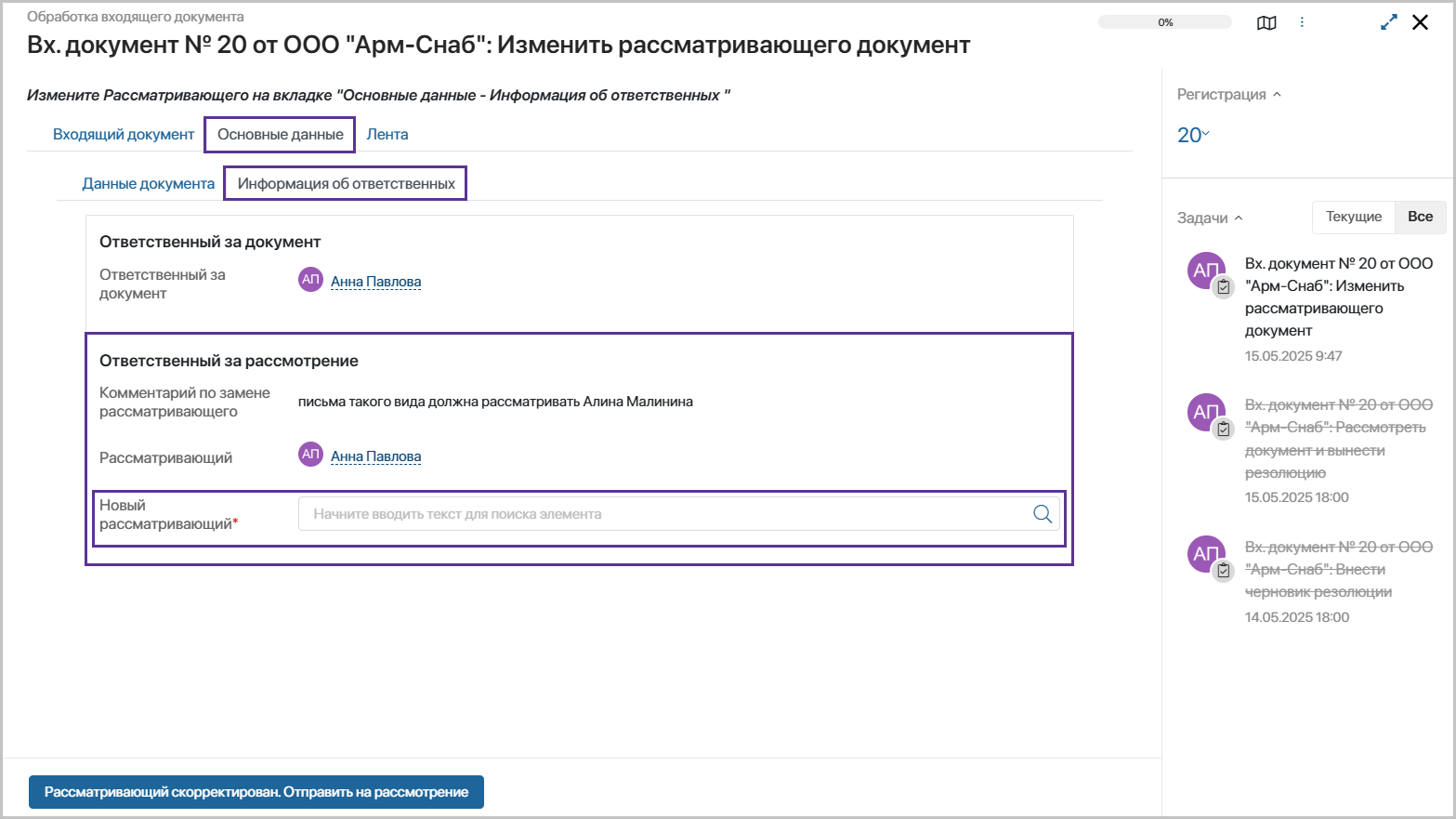| Изменение ответственного за входящий документ на этапе создания документа | при необходимости изменять значение поля «Ответственный за документ» при создании входящего документа | |