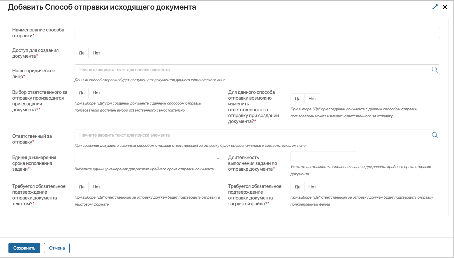 Для данного способа отправки возможно изменить ответственного за отправку при создании документа?* – укажите «Да», при создании документа можно изменить ответственного, «Нет» - если ответственный за отправку будет определен из способа отправки без возможности внести изменения.