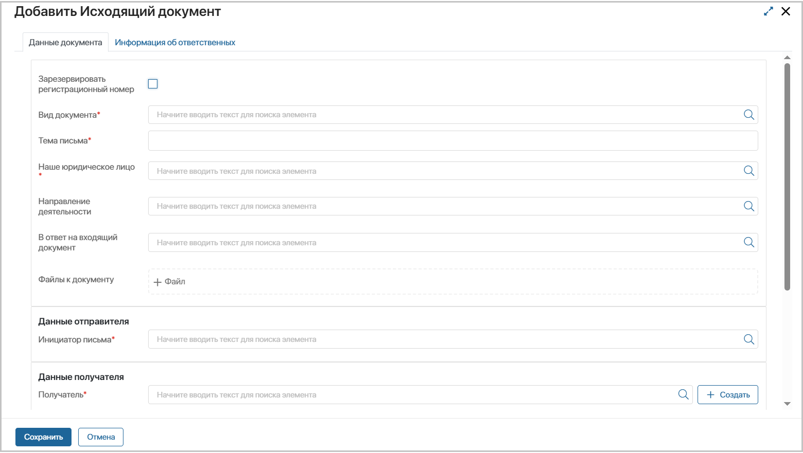 Получатель – выберите компанию из справочника, которой будет направлен исходящий документ.