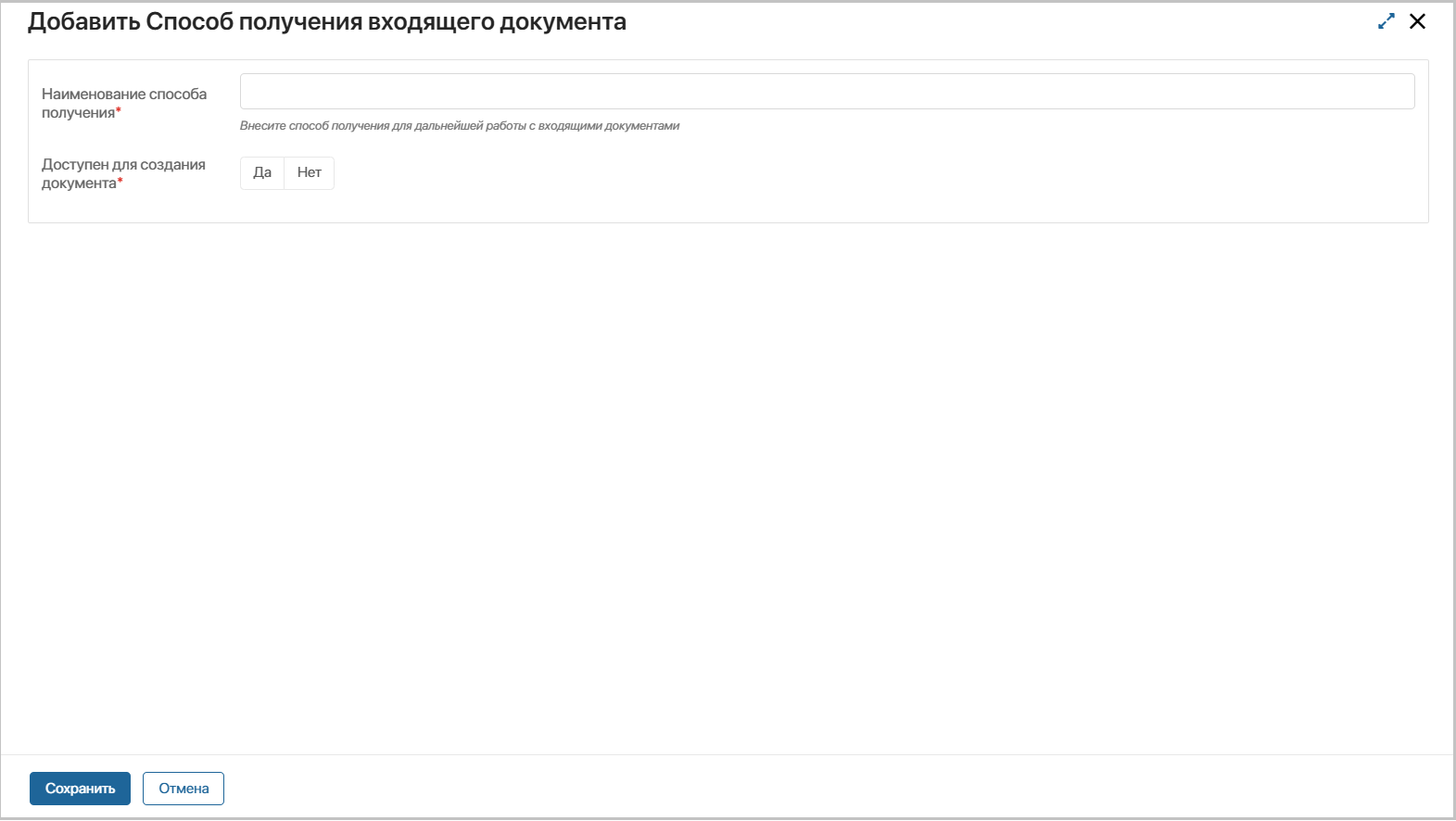 Внесите данные о способе получения входящего документа: наименование способа и возможность указать его при создании входящего документа.
