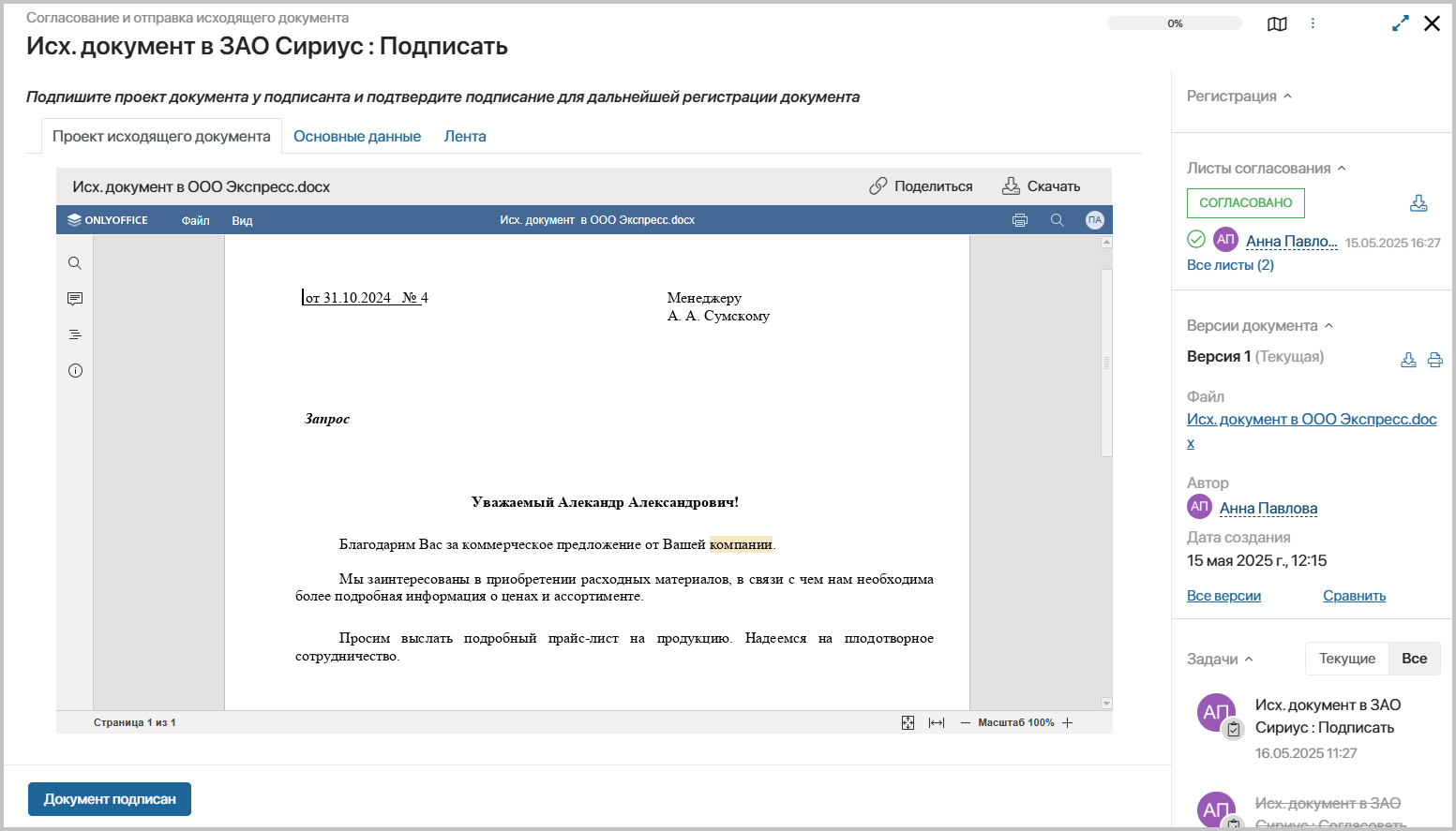 - Согласовать – проект исходящего документа будет передан на подписание.