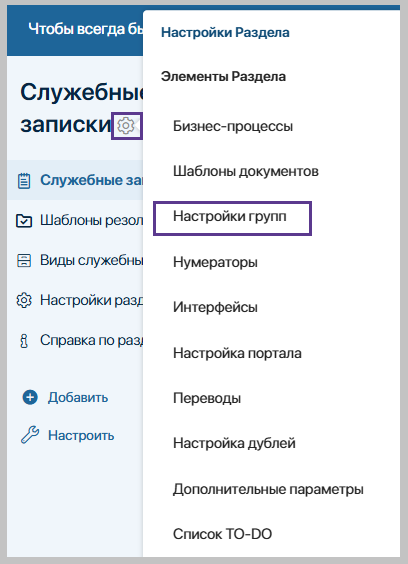 Для обеспечения функционирования раздела «Служебные записки» необходимо создать настройки раздела.