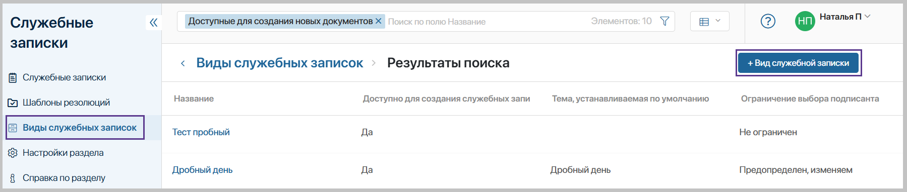 Доступно для создания служебных записок?* – укажите доступно создавать новые служебные записки этого вида или нет. Только доступные виды отображаются для выбора при создании документа.