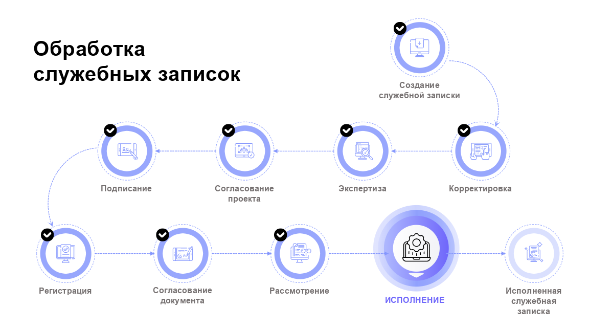В случае, если рассматривающим или сотрудником, которому было делегировано создание/исполнение было создано, то служебная записка переходит в статус «Исполнение» и находится в нем до исполнения всех поручений. Если поручение отменено, то служебная записка перейдет в статус «Аннулирована». Затем, служебная записка перейдет в статус «Исполнено».