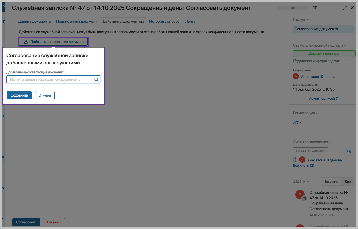 Чтобы добавить согласующих документа, перейдите на вкладку «Действия с документом» и нажмите кнопку «Добавить согласующих документа». В открывшемся окне укажите пользователей, которых необходимо добавить в качестве дополнительных согласующих документа. После сохраните изменения.