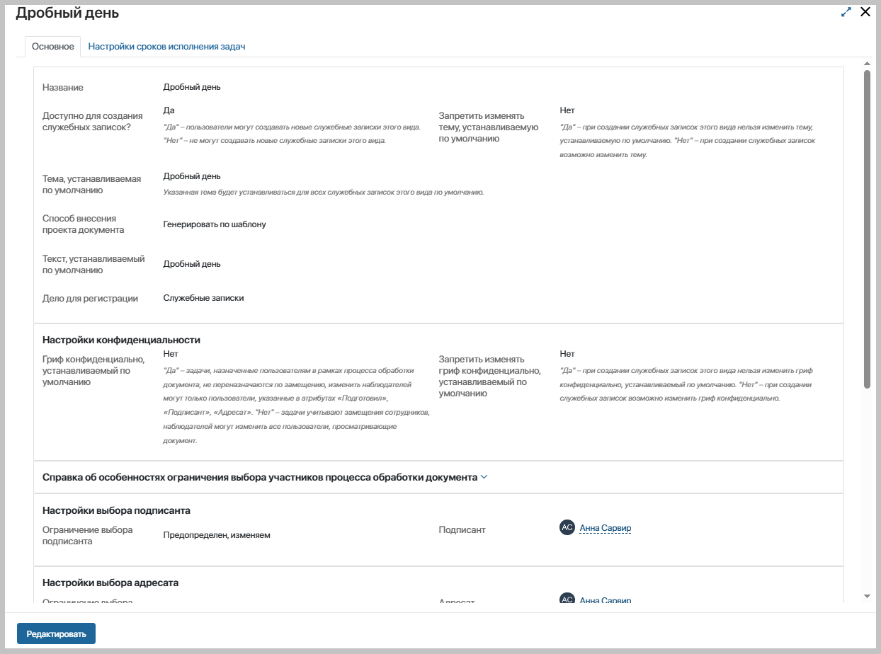 Страница просмотра настроек раздела содержит информацию, указанную при создании или корректировке вида служебной записки.