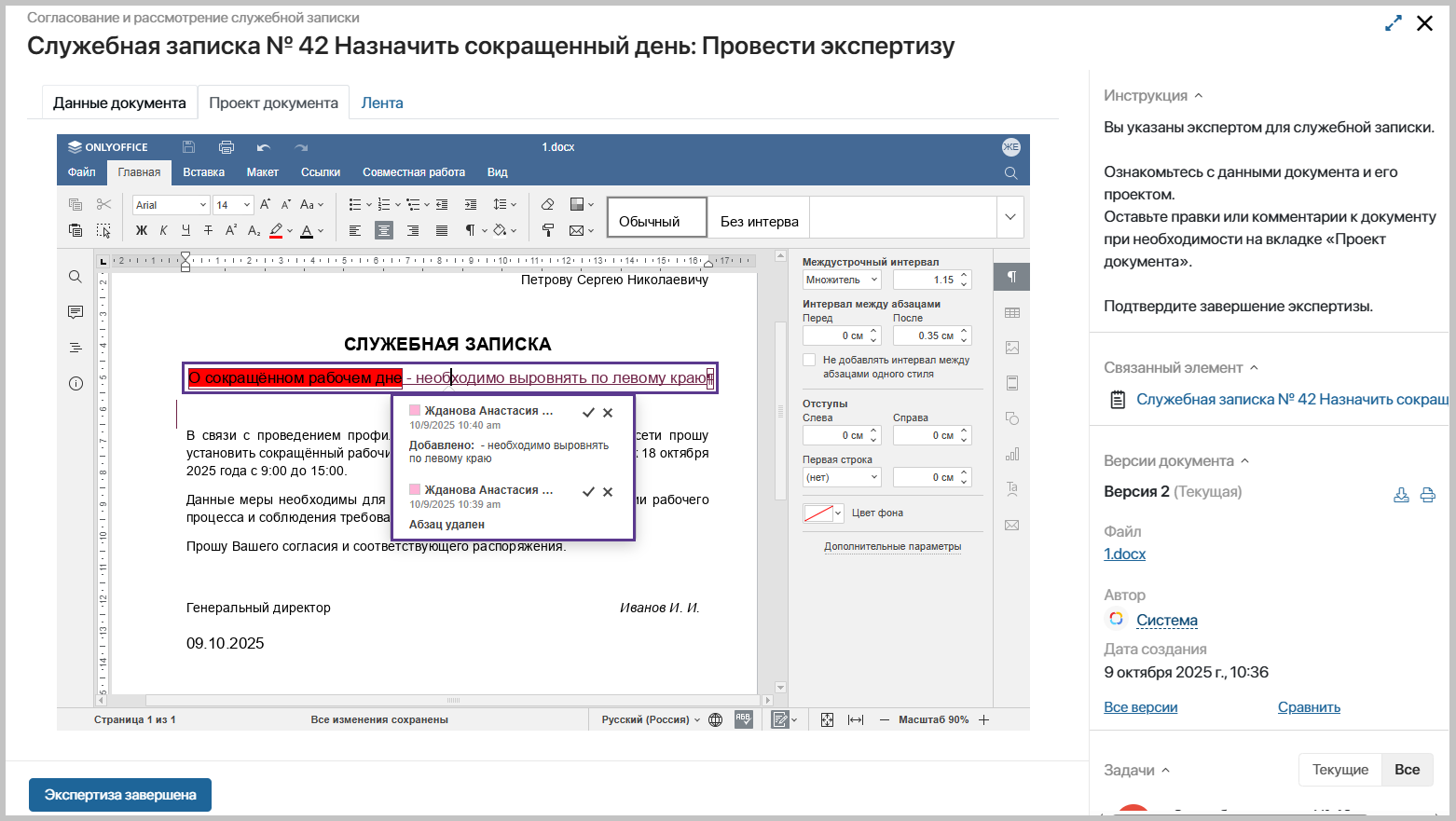 Задача «Согласование документа» ставится в случае, если вид служебной записки предусматривает согласование документа и при создании/редактировании документа были указаны эксперты.