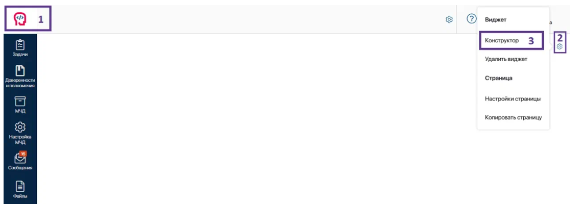 1. Перейдите на главную страницу системы Elma365 (1), нажмите на шестеренку в правом верхнем углу (2) и откройте конструктор (3).