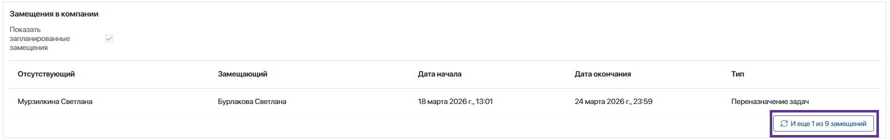 В состав решения входит виджет главной страницы «Все замещения», который позволяет просматривать текущие и запланированные замещения в компании.